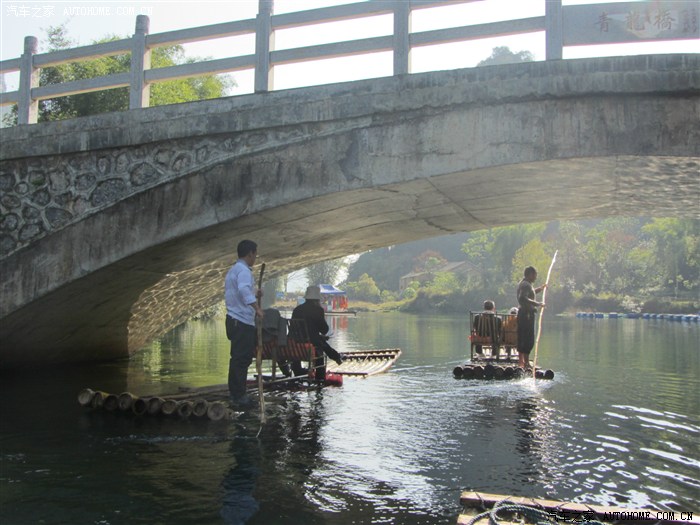 很好的意境,很美的画面。仔细一看,游客头顶位置有一蓝雨篷,右边河岸有一排蓝油桶 !有木有!!与周围的一切格格不入。遇龙河沿岸商业开发有点乱,缺乏统一的规划、形象设计与管理,店员、笩工等从业人员的服务水平有待细化培训。这些可以参考武汉东湖商业街的开发。本来遇龙河的卖点就是天然无雕饰。然而一路上雨篷油桶水泥不加掩饰的直露,把景致美感硬生生的破坏了,照相要避开这些取个景也不容易。亟须改善呀。