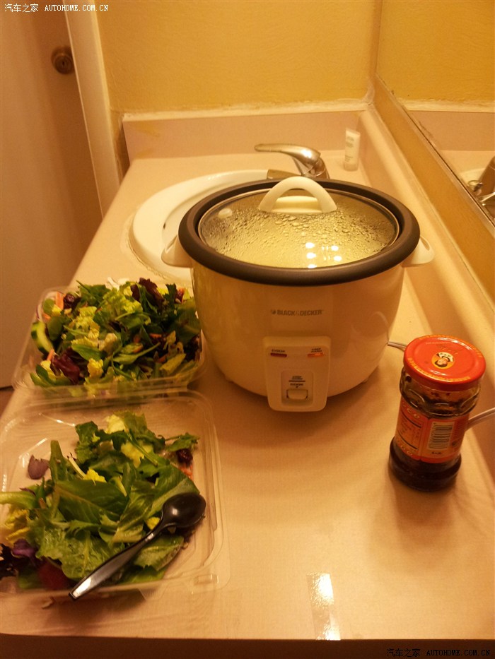 好多天没有正经地吃米饭了,后来确实没有办法了,自己花了19刀买了个电饭堡,吃米饭。由于没住在华人区,又没有锅,没法抄菜,只能老干妈拌沙拉吃,创新哟。