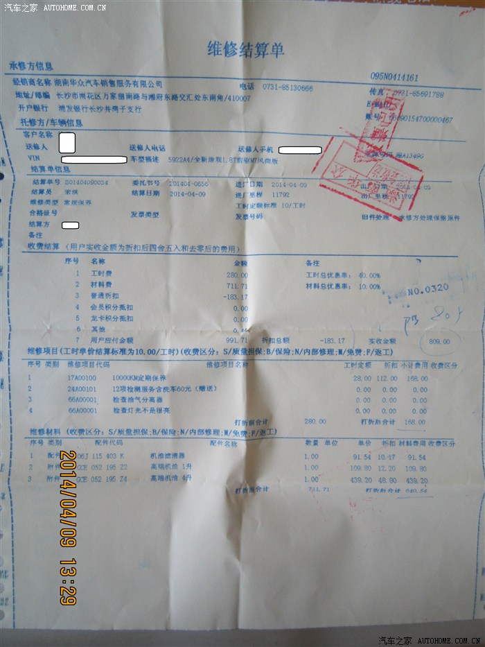 结账单,感谢长沙途观车友会蛋哥和车友会组织者。我使用车友会会员卡,根据车友会和4S的协议,工时费六折,材料费九折。工时费168元,材料费640.54元,合计809元。