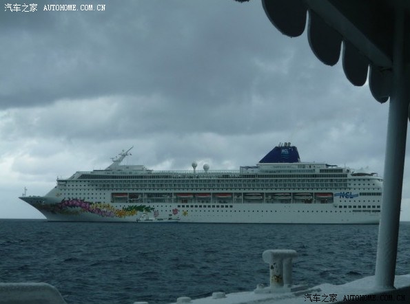 到岛上需要做小船才能上岛!远看Norweigian Cruise!