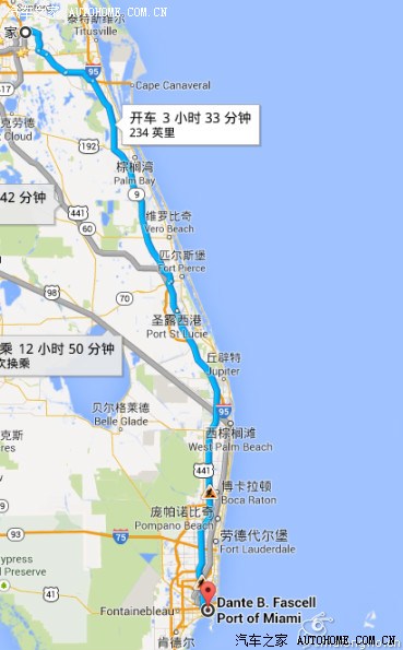 早上8点半从奥兰多出发,自驾车到迈阿密港口,全程234英里,共用3个半小时。