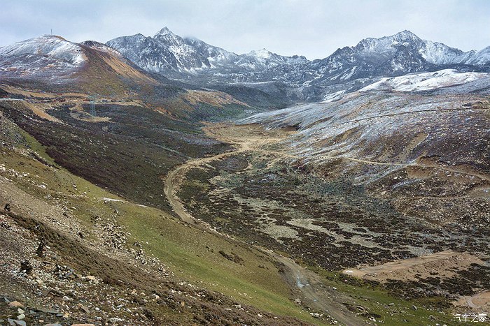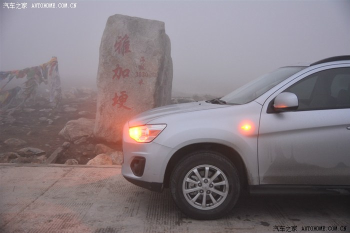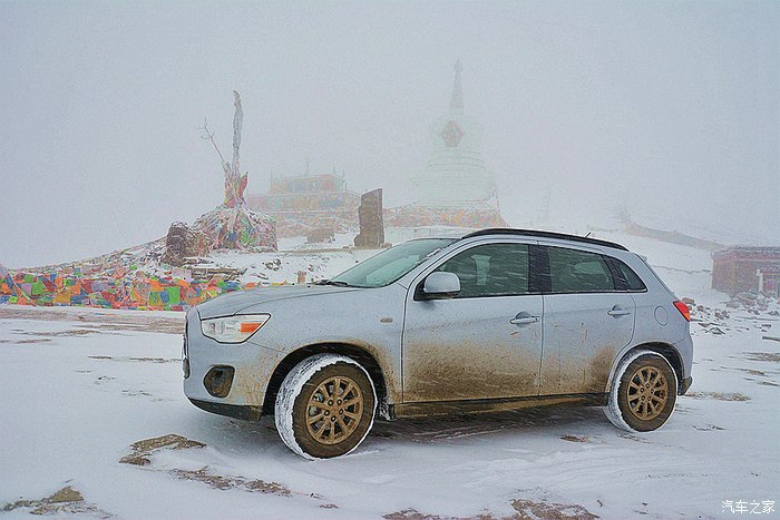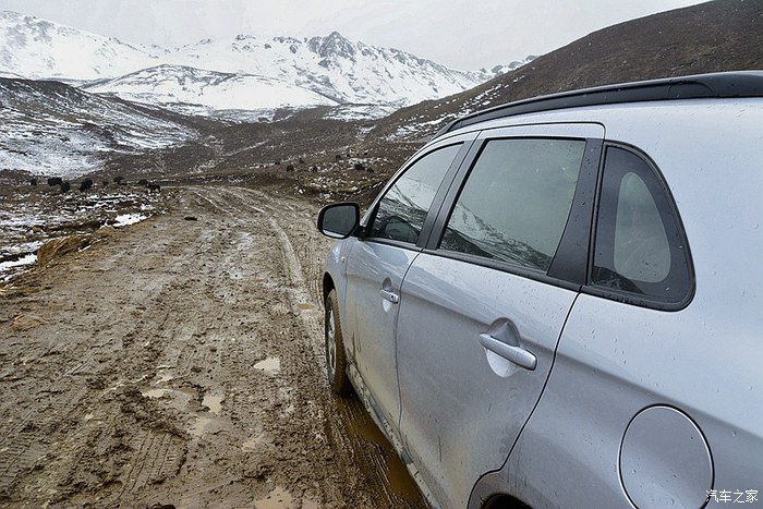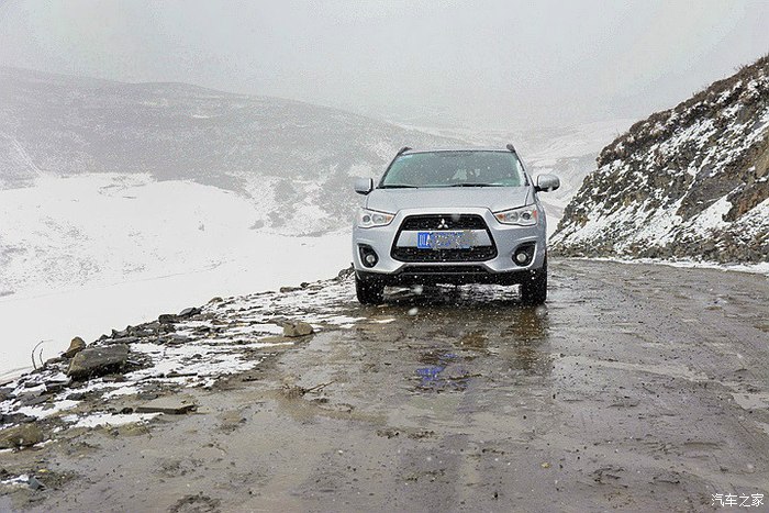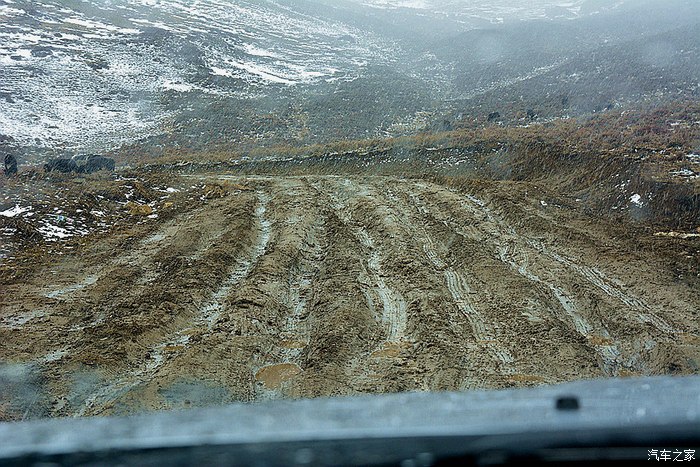 开头一段卵石路,颠得屁股疼,而后又是土路,上坡,上坡,再上坡,回头弯,连绵不断。减档,轰油,仗着195mm的底盘高和127千瓦的发动机动力,小三奋勇向前。高原上,感觉车子动力有衰减,于是有几次,故意在高档位一脚油门到底。果然,不但不提速,发动机转速也就只在一千来转上不去。这就应证了”海拔每上升一千米,发动机功率就下降10%“的定律。车有高原反应正常,4000多米海拔,车子动力得减40%几,什么概念! 车到半路,天气突变,一会儿雨雪交加,一会儿冰雹乱砸,最大的难点出现了:前面一百多米上坡路段,是深深几道车辙,大约200mm的槽子,全是湿滑烂泥。若不过,那就前功尽弃,过,显然有问题。那好,咱门先拍摄取证再下火海吧!冲,一档,中等油门,把稳方向,杀入敌阵。果然,车一进烂泥槽,立马侧滑,一路秧歌扭向前,接着就听一阵哗哗的托底声,这时心里只有一个念头——千万别陷死,千万别挂破油箱! 在这半天都不见人影的高山大野里,陷住了哪个来救你?还好,托小三的福,这些都没发生,车子闯过了这一关,一路轰鸣,直上雅哈垭口。
