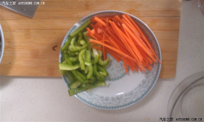 木耳、青椒、胡萝卜切丝。青椒和胡萝卜可以切细一点,可缩短烹饪时间