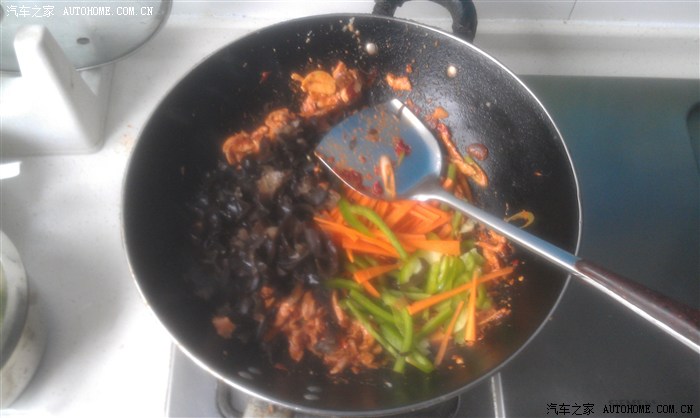 放入备好木耳丝、青椒丝、胡萝卜丝,翻炒