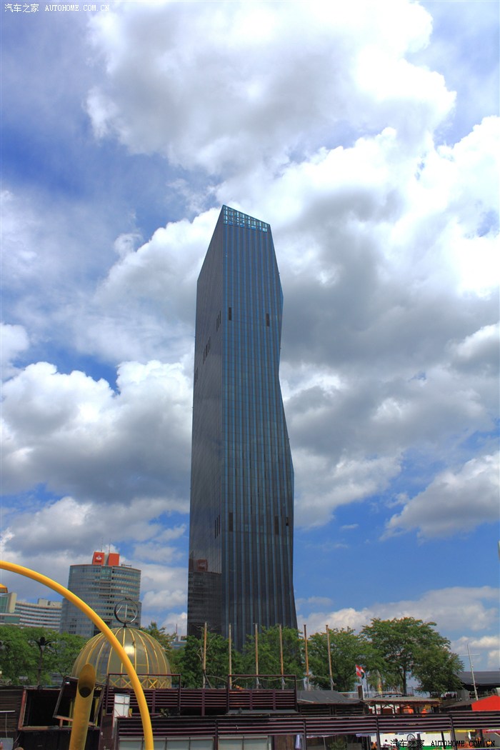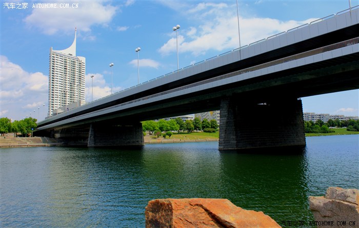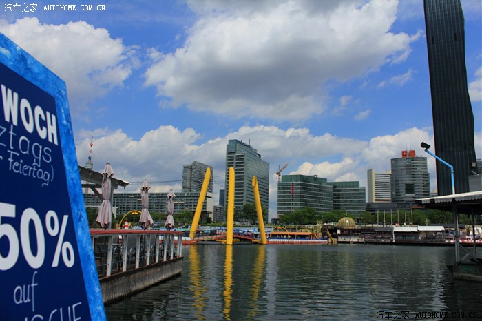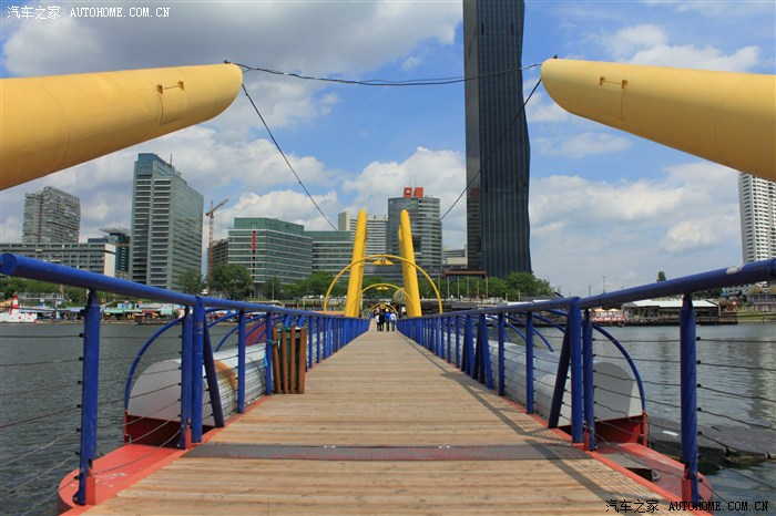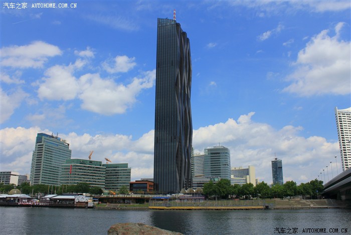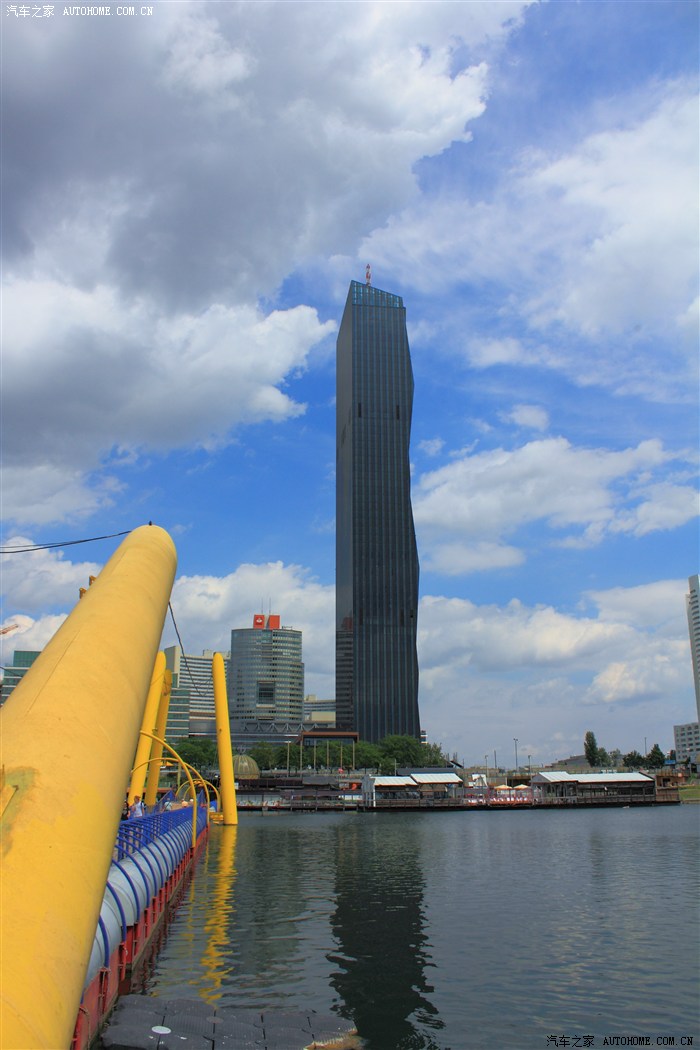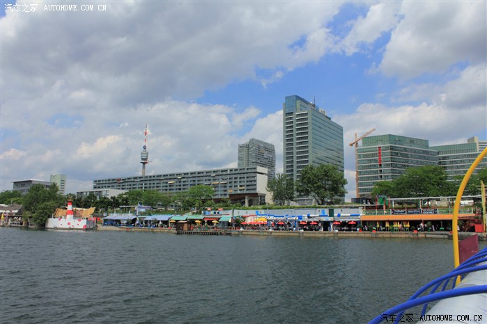 远眺河北岸的主体建筑,中间的黑色大厦就是目前维也纳的的最高建筑。准确说多瑙河以前不像其它欧洲的一些知名城市那样,穿城而过,而是绕城而过。河北岸以前都是农田,属于下奥地利州。后因为城市扩建成为了维也纳的21区和22区,所以北岸没有古建筑,都是后起的高楼大厦。大厦后面几个楼群就是联合国维也纳总部(也可以这样理解,二战后把一块荒地给了联合国