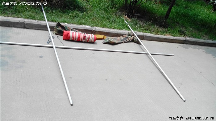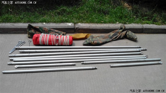 这是搭天棚用的东西,天棚宽3米,长4米。高2.5米,下图那两根垂直放着是立柱,水平放的那一根长3米(2x1.5米)。穿在布的一端,布上缝有两个钩子,挂在车顶行李架上预设的鼻子上。布的另一端两个角挂上立柱和绳子,拉起来,用地锚把绳子固定住,天棚就搭好了。
