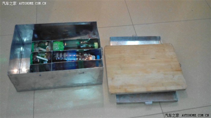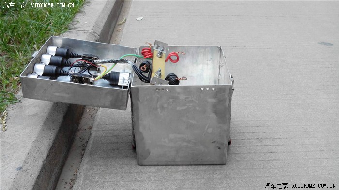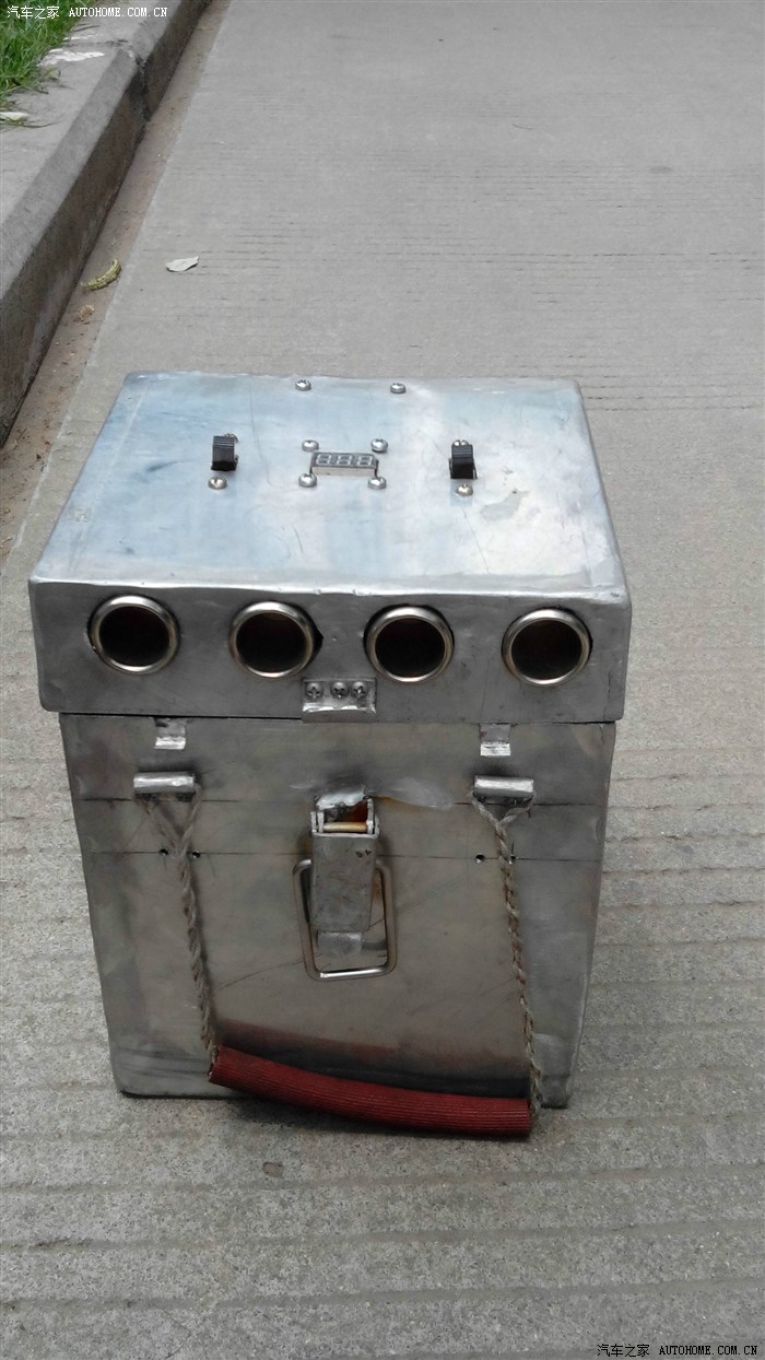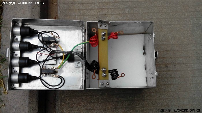 这是备用电源箱,可以装两块20安的电动车用的电瓶,(自家电动车上的)并联在一起成40安。那块胶木板上装有4毫米的紫铜板(翻到下面了),可承受大电流用于启动汽车的发动机。盖上装有数字电压表,两个开关各控制两个点烟器插座。用于行李架上的四个野营灯。反方向装的那一个插座,不受开关控制是充电用的。开车时充电,停车时断开。