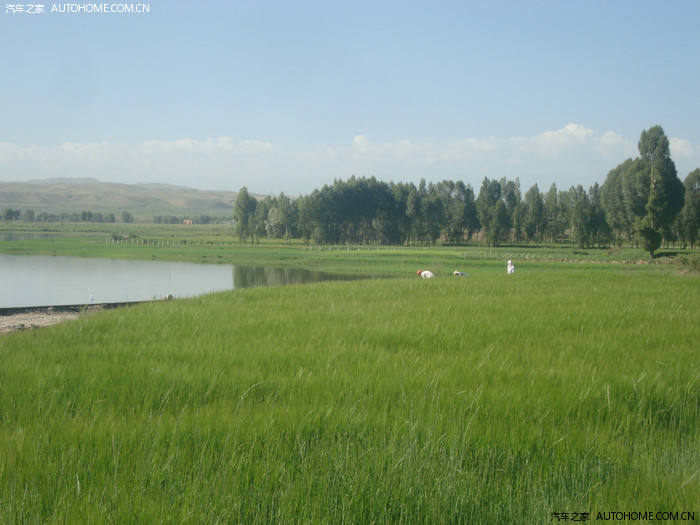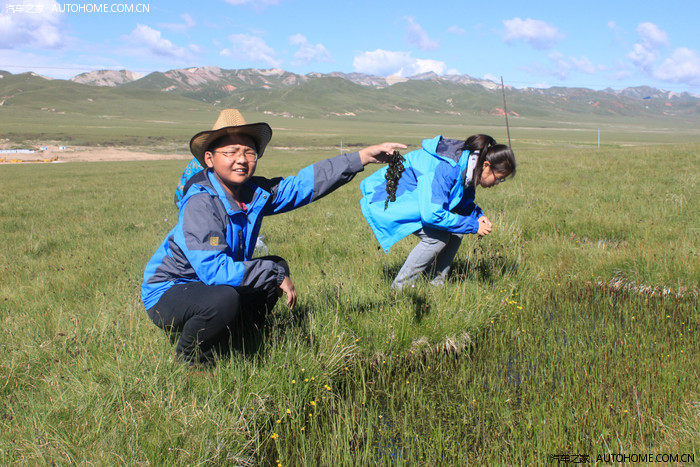 蓝天白云。路边的一处草滩上,停留了许多车,有人在草原上来回寻找着什么,“蘑菇”,我喊了一声,赶紧靠边停车。走下去一看,原来不是在采蘑菇,而是在捞当地的一种叫地打菜的东西。孩子们也兴致勃勃地捞了起来。