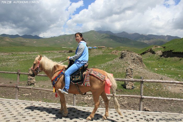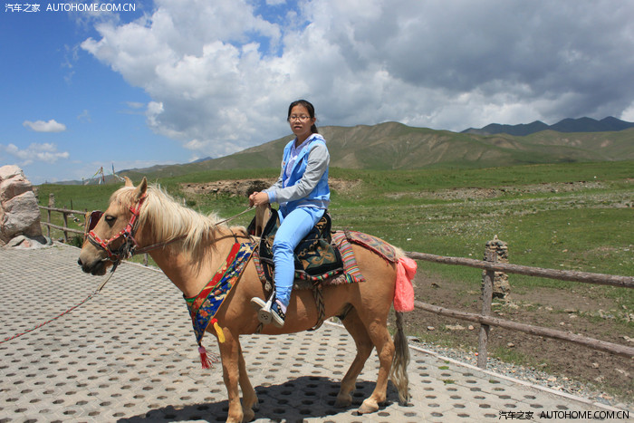 这个地方有牧人牵马在此处营业,照相10元,骑马遛一圈20元,孩子一直没有在草原上骑过马,那就让她骑上过过瘾吧。这个地方叫金银滩草原,今年这边雨水较为充足,牧草长得很丰美。适合纵马驰骋。可惜我的娃骑术不精,只能让牧马人牵着走一圈喽。