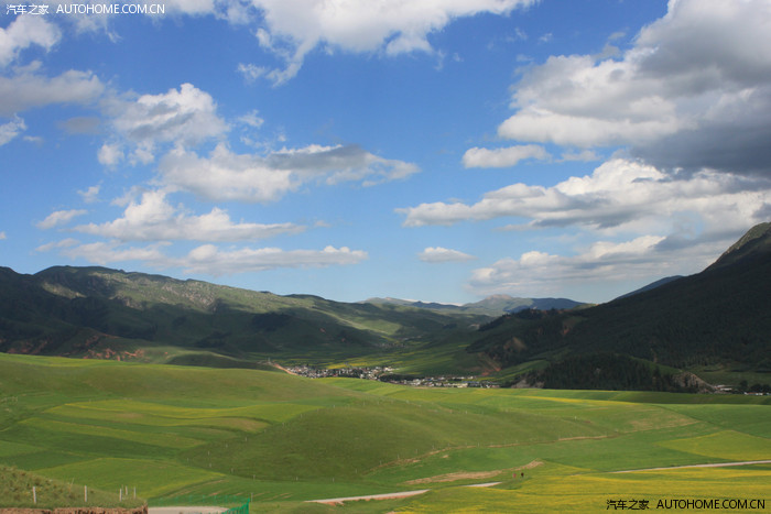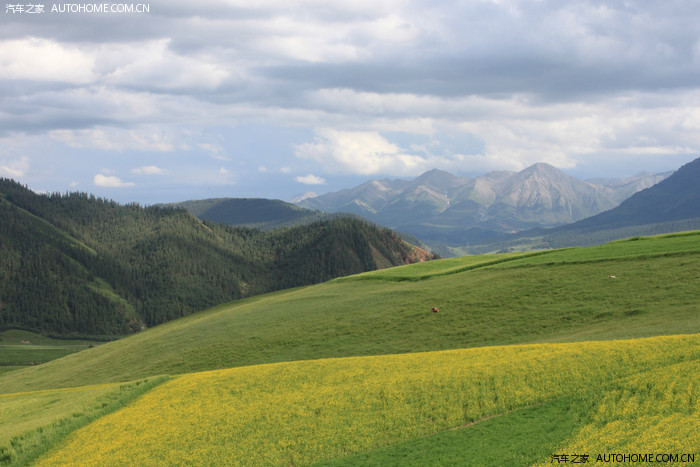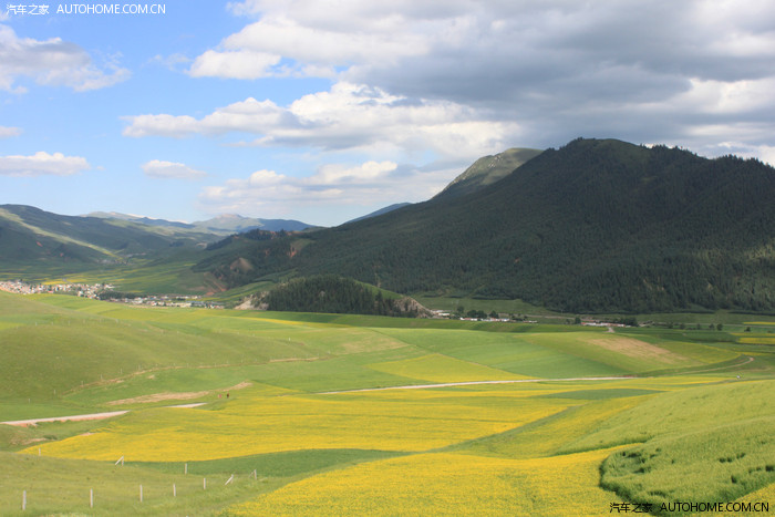 山下大片的油菜花间杂在翠绿的草原深处。