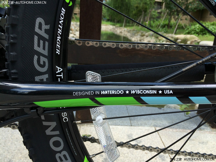轮圈是Bontrager AT-650 32 孔双壁 很结实,上台阶一点都不心慌。轮胎是Bontrager XR1,29x2.20" 前,29x2.00" 后(Bontrager XR2,27.5x2.20")。很不错的一款轮胎,但是骑山马的比较多,平路稍累点。