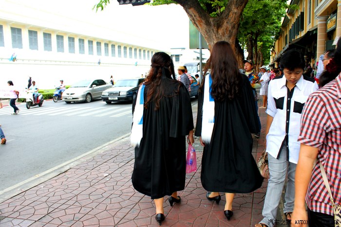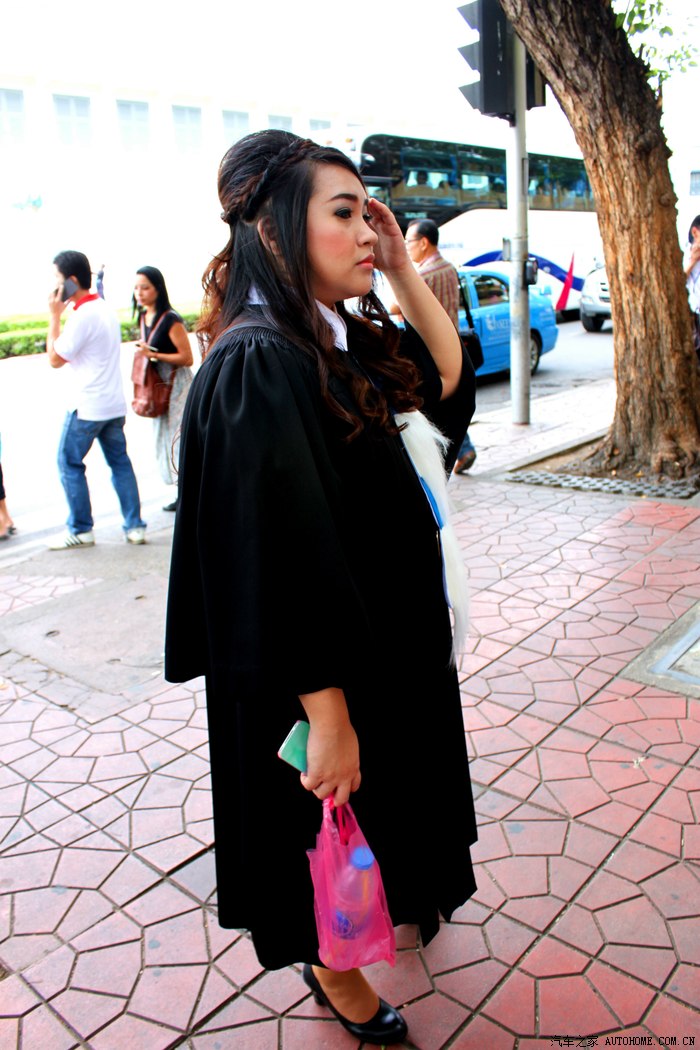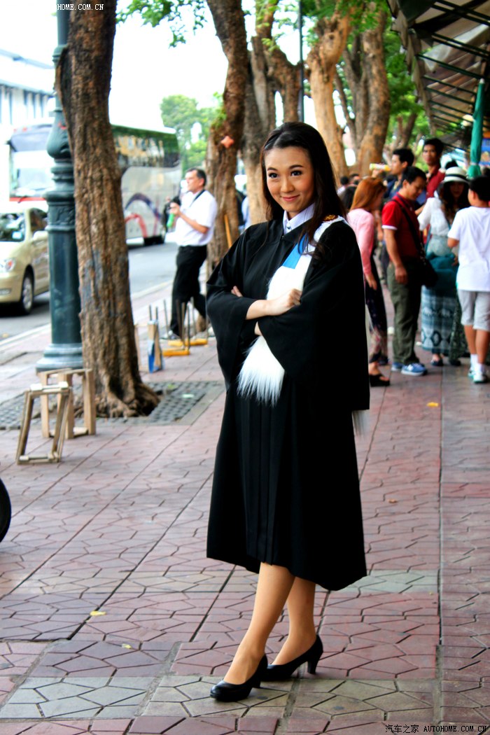 身着学士服的泰国女大学生在毕业的季节走在街上拍照留影