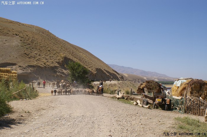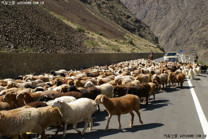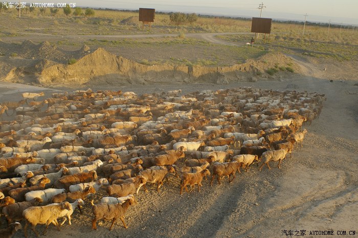 从山里转场到山外的羊群。在新疆行车,要养成不冲撞羊群的习惯,慢慢的,羊先走,车再走。