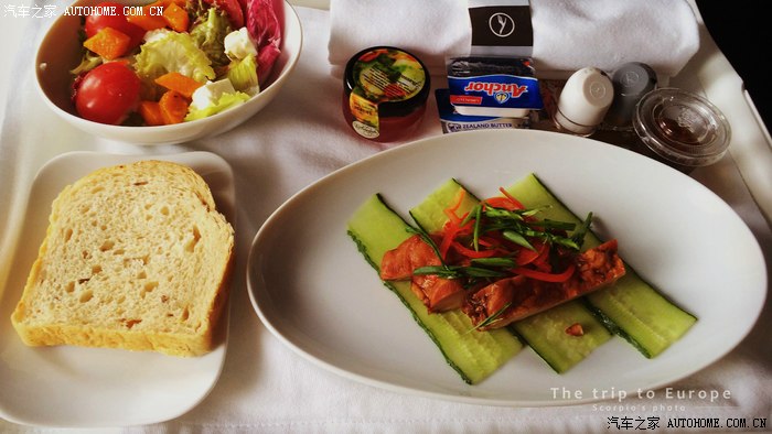 商务舱的餐前点心;商务舱的晚餐分为三道、分别是餐前点心、正餐(牛排、鳕鱼)、餐后甜点(提拉米苏)