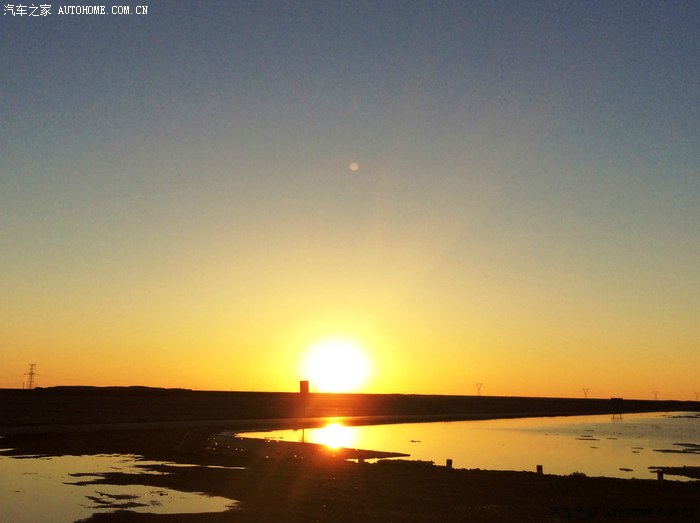 夕阳映照在戈壁滩难得的积水里