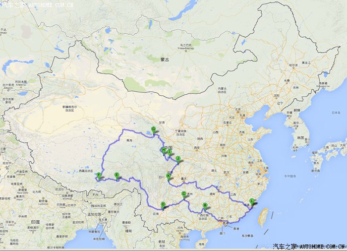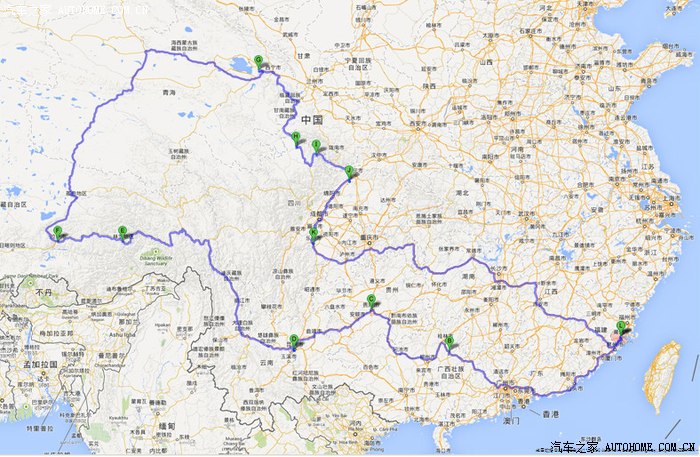 实际行车路线图:滇进青出!经过:福建、广东、广西、贵阳、云南、西藏、青海、甘肃、四川、重庆、湖南、江西等12个省、自治区、直辖市。