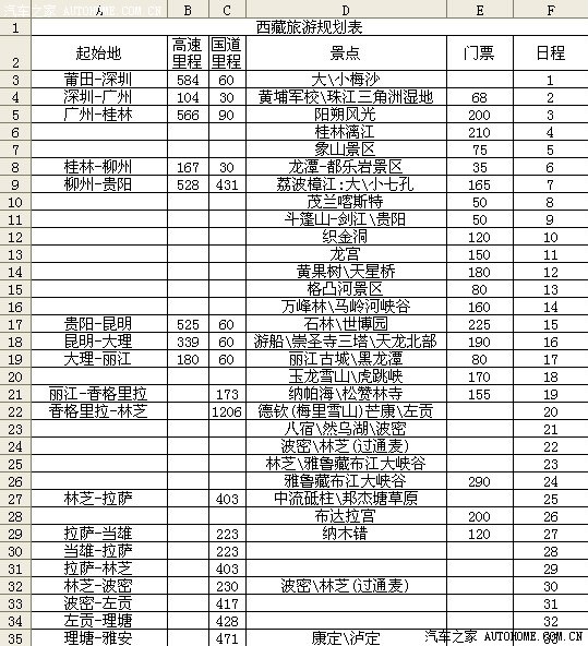 自从成为汽车之家的一员之后,我就喜欢上了自驾游这个栏目,大家在这里分享自己的辛酸与快乐!探讨出行的得与失!里面有太多的精彩和诱惑,成了我休闲时的一大去处。各位前辈的帖子我看了不少,特别是有关西藏方面的,真是如获至宝,突然萌生了勇闯西藏的想法和勇气。本来想明年去,再做一些功课和准备,特别是车子方面。听说通麦的路很烂,没有越野车过不去,囊中羞涩,换车是不可能了!不过贴子中也有不少轿车去西藏,想想我的本田锋范应该可以过去,车子的性能我相信没问题,就是底盘矮了点,凑和着用吧!刚好去年的一笔工资补下来了,两人共一万多元,想想再不疯狂一次就要老了,快到不惑之年了,人的一生如果没有去一次西藏那多没意思呀!那个与太阳最近的地方!人间的最后一片净土!神圣而神秘的布达拉…所以我决定来一次说走就走的旅行!难得夫人和儿子一致通过!学校一放假我就开始做功课,购物品(地图册、炊具、帐篷、照明灯、小铁锹、行车记录仪、食品、相机电池两块、墨镜、帽子)、药品(消炎、感冒、止泻、防暑、防晒、防蚊虫、外用类),从蚂蜂窝下载各地旅游攻略(在此感谢蚂蜂窝提供的一切资料,很实用!),规划行车路程,预算开支,忙得不亦乐乎!