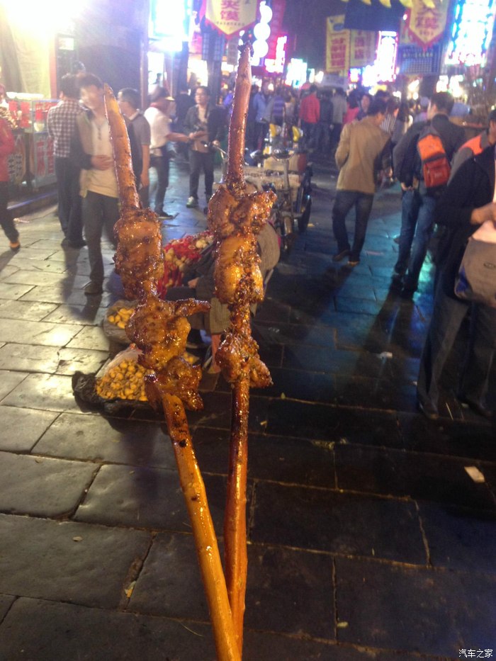 羊肉串啊!签子得有30多公分长,三块羊肉,十块钱一串,不过哪味道真是香啊!从小到大没吃过这么好吃的。现在西安对我来说等于回民街等于羊肉串啊!什么?千年古都……。敌不过胃啊!