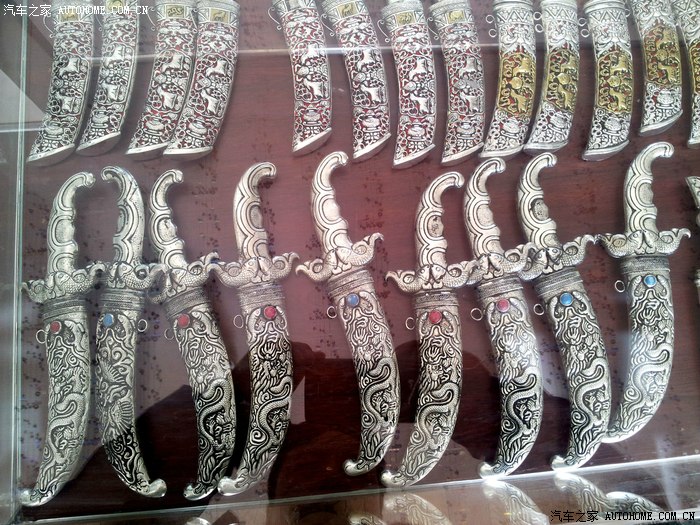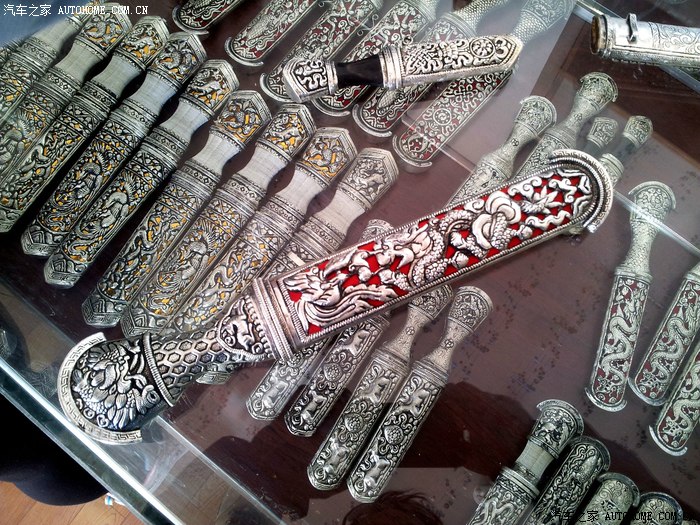 精美的各式手工藏刀,刀鞘雕花是藏银的。