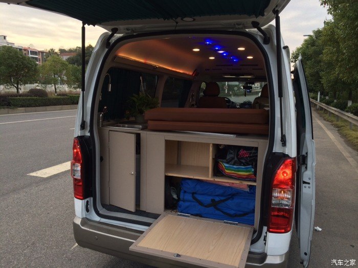 后门储物柜,一柜多用、把门板放下可以用做操作台,切菜[呲牙]旁边有洗菜盆,水靠直流水泵自动抽上来,有一个50升的净水桶,污水直接排到车外,水龙头上方有一个LED的台射灯,方便夜间操作,很方便啦!