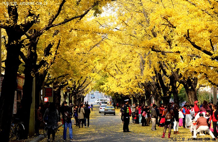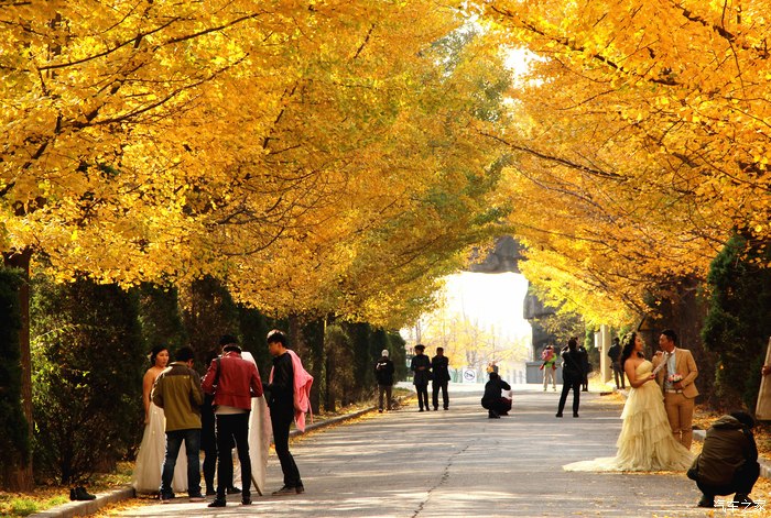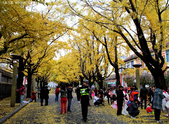 丹东市的九纬路被人们誉为“金光大道”,每当十月下旬,交警都会实行交通管制或交通疏导,以满足各地游人摄黄的需要