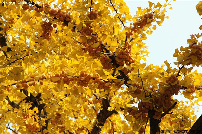 银杏树从栽培到结果需要20多年,并且刚开始结果很少,等到40多年以后才会大量结果。像这样果满枝头的银杏树在丹东随处可见