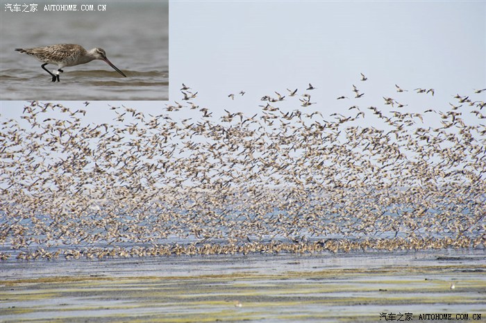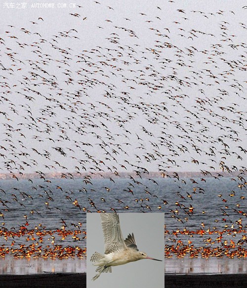 斑尾塍鹬有“世界飞行冠军“之称,它可以不吃不眠连续飞行7、8个昼夜,行程一万多公里,从澳大利亚、新西兰飞抵鸭绿江口湿地停歇。出发时体重大约有一斤多,然而到了鸭绿江口则只有5两重了。经过一个多月的能量补充,再次远行前往俄罗斯东部及美国***斯加。