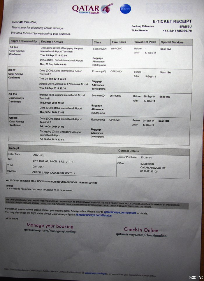 2014年9月底的这次旅行很突然 因为朋友突然给我说卡塔尔航空机票打折 于是我们就在没任何准备的情况下定了重庆到雅典 伊斯坦布尔到重庆的往返机票 一人3000多点软币