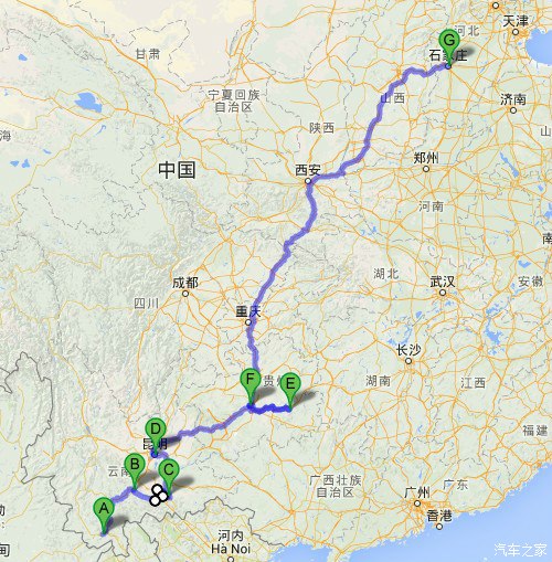 基本路线:石家庄—榆次—西安—汉中—成都—西昌—泸沽湖—丽江—虎跳峡—香格里拉—大理—腾冲—盈江—瑞丽—保山—昌宁—云县—临沧—双江—澜沧—景洪—元江—红河—元阳—建水—个旧—蒙自—石林—昆明—曲靖—安顺—凯里—雷山西江苗寨—青岩古镇—贵阳—遵义—重庆—达州—安康—西安—韩城—榆次—石家庄。总行程9287公里。