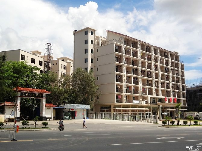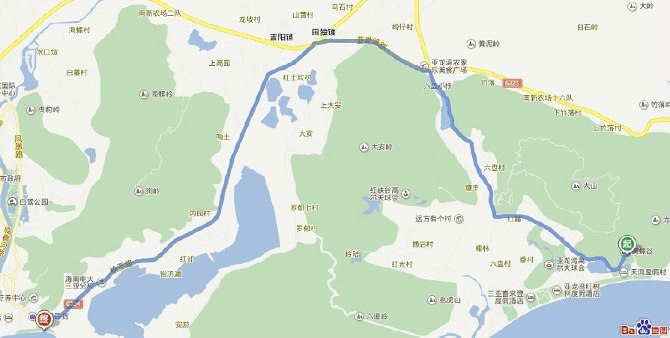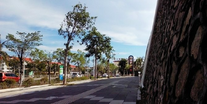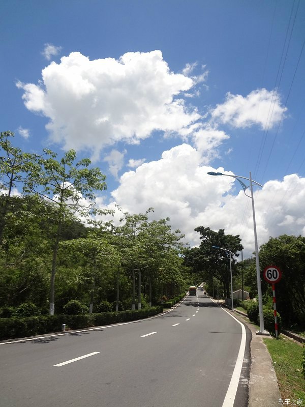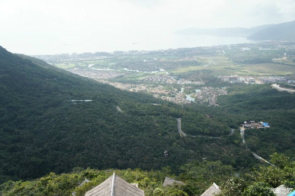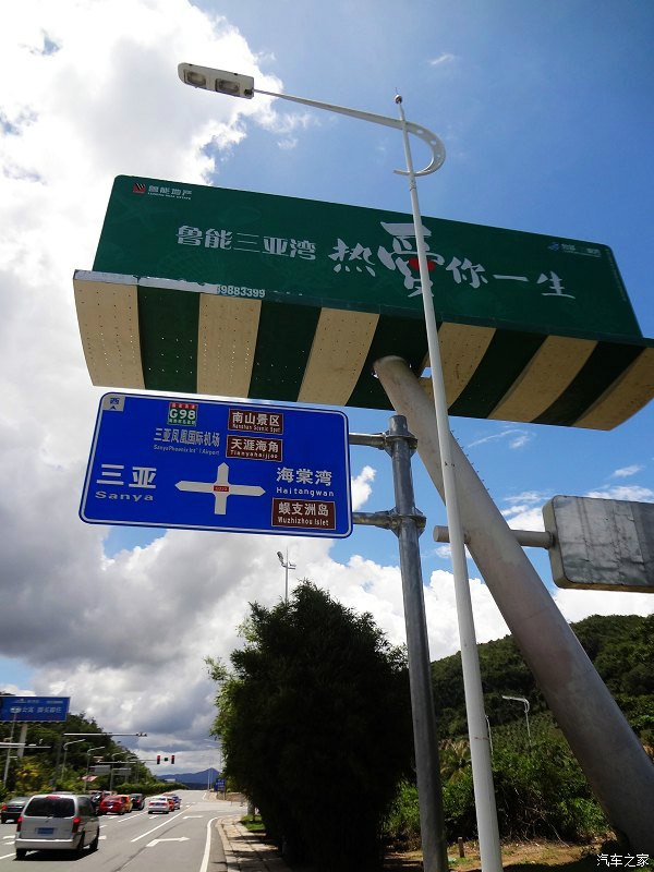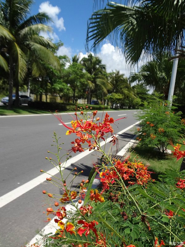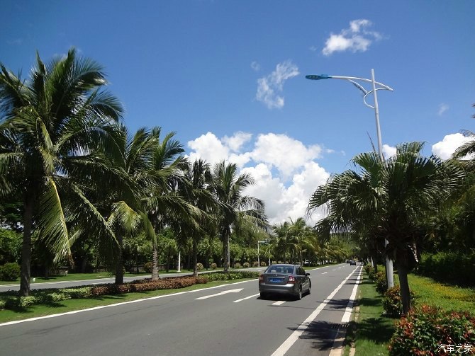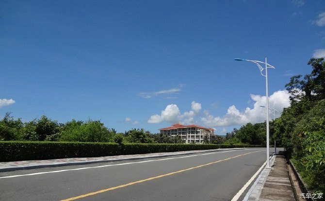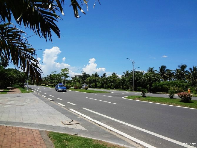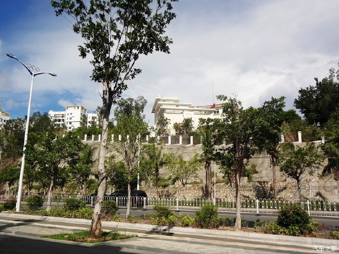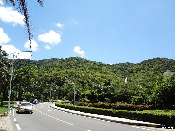回头望去,路上除了时不时的车辆通过,几乎没有行人。 路边的树够高大,但是由于位置的原因,并不能起到遮挡的作用。 差不多还有三分之一的路程,这时候的在下,已经被晒透了,感觉被晒伤了。 三亚的阳光可不是闹着玩儿的... 三亚的平地并不多,更多是这样的丘陵地带,很多建筑都建在小山丘上。