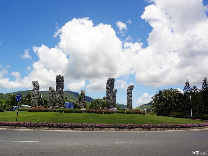 这里的几根柱子,是亚龙湾度假区的入口标志。这是整天步行的第一个岔口。 据说有伙伴,在夜晚开车经过这里,鬼打墙似的转了两次,都走错了路口~~~