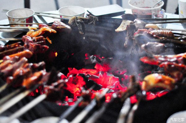 一下午的时光都泡在邛海边,眺望远山,亲近碧水,冬天的西昌天黑比较早,一天的奔波让人有些饿,今晚的大餐选在当地颇有名气的一品红烧烤城,典型的西昌火盆烧烤,一进去就看到好大个火盆。火红的炭火,用铁皮围起来。铁皮上面有刻槽。方便放竹签。很豪迈的感觉。都说到了凉山就是要大碗喝酒大口吃肉。火盆的碳味配上油滋滋的肉香,那滋味儿,超赞!