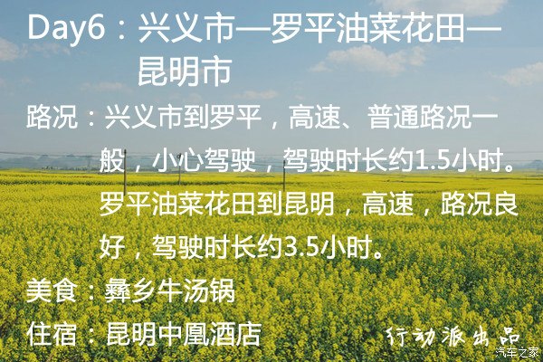 【第六天】兴义市—罗平油菜花田—昆明市    从兴义市出发,前往罗平油菜花田,这趟旅程中,第二次看油菜花,不知和万峰林早春的油菜花田相比,又会带来怎样的惊喜?从兴义到罗平,驾车也就1个半小时。在罗平看油菜花,天气很重要,当地的气候变化多端,可能天气预报说的晴,可到了当地发现雾蒙蒙的,不过一般早上10点过,雾气也就慢慢散去了,阳光照在金灿灿的油菜花田上,分外美丽。除了站在油菜花田旁,近距离体验身处花海的奇妙感受,看着身边满目金色,不远处蜂蝶纷飞,经历了一个冬日的寒冷,在这里和春天来个最早的约会。想要看油菜花田的全景,可以去金鸡山上,花海的壮阔尽收眼底,无数的小岛...