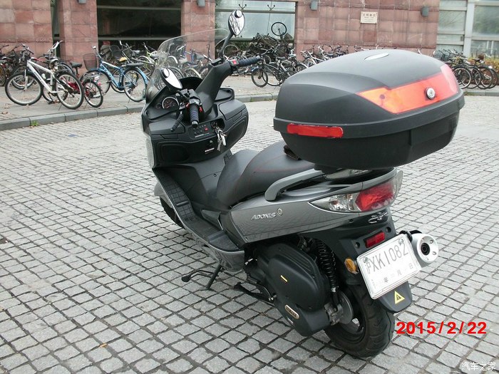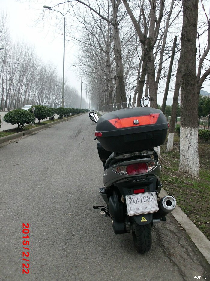侧面卡擦一张 12寸轮毂小了有些遗憾 发动机边罩和雅马哈贴纸是自己淘宝的 原厂GY6边盖实在太掉价了 车子坐垫上补的那块皮子是因为本身质量不好 开裂了 绝对不是我把它压坏的 :-(