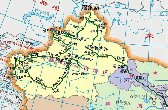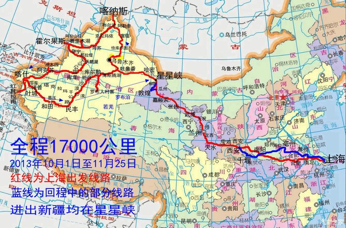 上海~西安~兰州~星星峡(甘肃新疆界口)~(北疆)哈密~吐鲁番~乌鲁木齐~阜康~恰库尔图~可可托海~富蕴~布尔津~喀纳斯~布尔津~克拉玛依~乌苏市~博乐市~***山口口岸~赛里木湖~霍尔果斯口岸~伊宁~那拉堤~天山公路~巴音布鲁克草原~(南疆)库车~阿克苏~神木园~喀什~塔什库尔干(帕米尔高原)~红其拉甫口岸~塔什库尔干~莎车~泽普~叶城~和田~民丰~塔克拉玛干大沙漠公路~塔河镇~塔里木胡杨林~轮南~库尔勒~吐鲁番~星星峡~柳园~敦煌~瓜州~嘉峪关~张掖~武威~定西~宝鸡~西安~十堰~武当山~南阳~亳州~滁州~上海