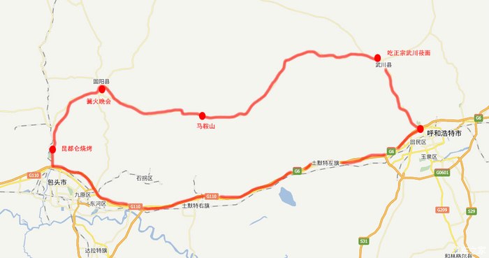 - 行程1: 行程1:到包头取车   包头-呼和浩特-武川-马鞍山-固阳-昆都仑-呼和浩特