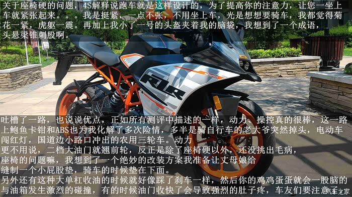 解惑:利用率真的不是很高,上下班使用,市内堵车,发挥不出来,又没有赛道。而且骑这种车很累,加上非常硬的座椅。以我个人观点看,还真的是300CC左右排量的中羊实用性最高,上下班代步、中长途游玩、拉人载货、真的是比较方便。最主要的是自动挡。其实RC390对于我来说就仅仅是车库里一定要有的一部赛车而已。