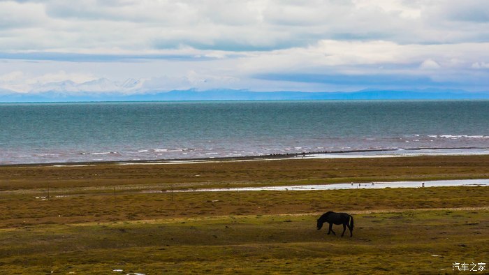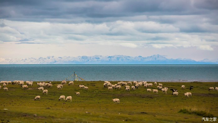 湖边绿草如茵,牛羊成群。对面的雪山应该是祁连山脉。