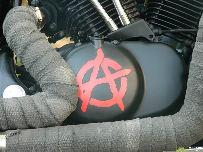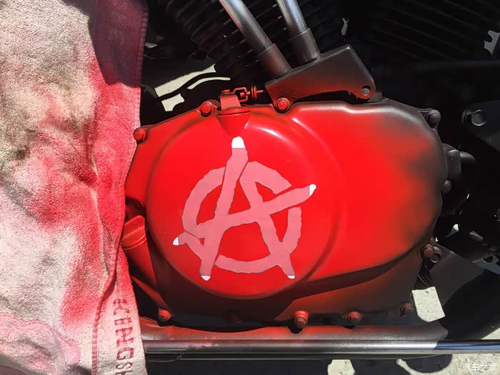 作为混乱之子死忠,我想把logo喷在发动机上。先用铁水泥磨平了原有的honda标志,打磨之后用喷汽车卡钳的高温漆先扫一遍做底,贴上混乱之子的logo(手工在背胶纸上剪出来的哦,手艺不错吧哈哈),然后喷黑,再撕掉贴纸,效果怎样呢?