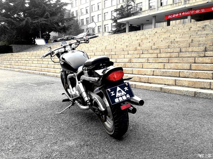 提车那天,载着室友一路回到学校,还能记得当时激动的心情。当时提车前就买了一些改装件让车行装上了:短排气,直把,尖头加高柱,骷髅后视镜,电镀水箱盖,电镀转向灯等。当时还是可以载人的,比现在实用性要强很多。但是我总觉得比例不协调,前后高,中间过于低了,没有力量感。