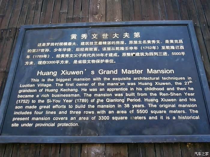 ↑ 千年古村入口一千多年前,为躲避黄巢起义,古村的祖先从湖北古荆州迁徙到此,依山傍水建立起新的家园,繁衍生息。村中古街的两旁,店铺林立,青石板路首尾贯通,光滑的石板中间有一道深深的宽约两指的车辙,那是独轮车所留下的痕迹,行走在其中,当年临墟时兜售的吆喝声依然在耳旁回响。祖辈很有经商之道,诚实守信,在连升三级,位居四品时,精心修建庄园,恩泽子孙。庄园内,雕梁画栋,其木制结构建筑之布局、门窗雕琢之精美令人叹为观止