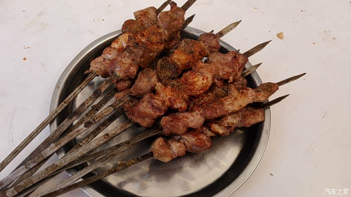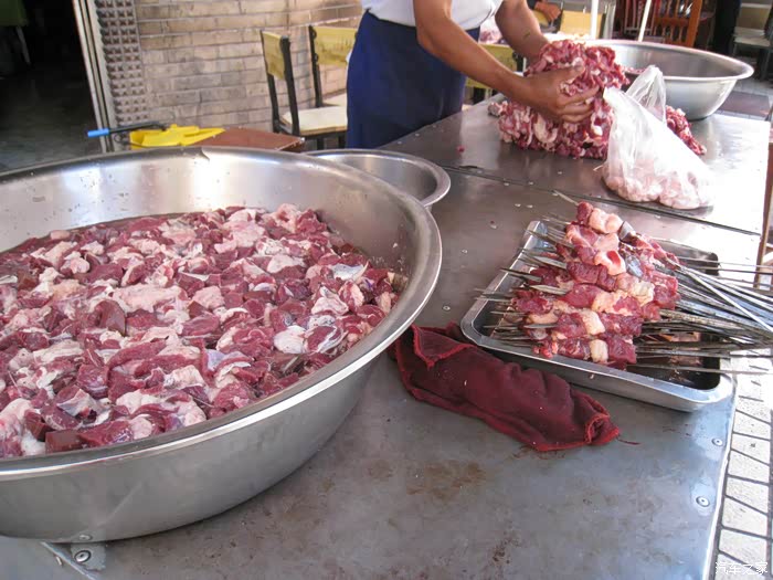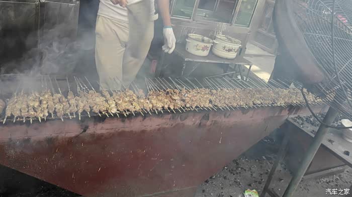 超级长的烤肉串,烟熏火燎的,很有新疆味道