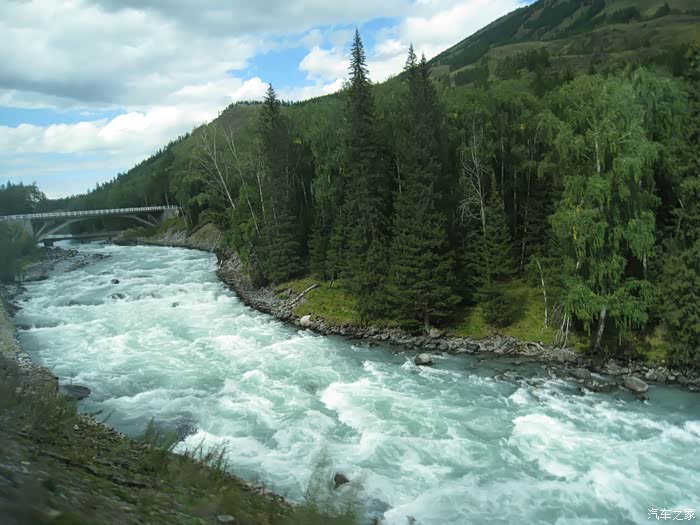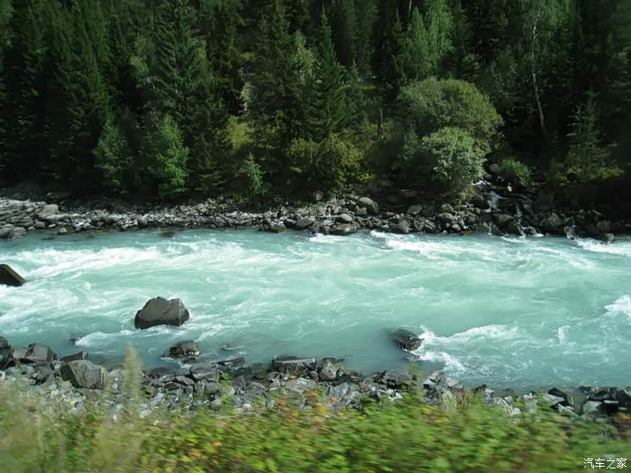 大家看到河水是蓝绿色的,这就是说我们快到喀纳斯了