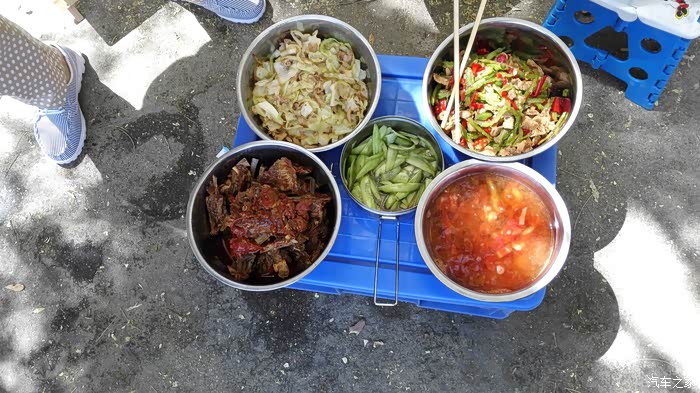 这是我们出发做的第一顿饭,四菜一汤,苦瓜炒肉,红烧牛肉,肉丝炒圆白菜,凉拌黄瓜,西红柿鸡蛋汤