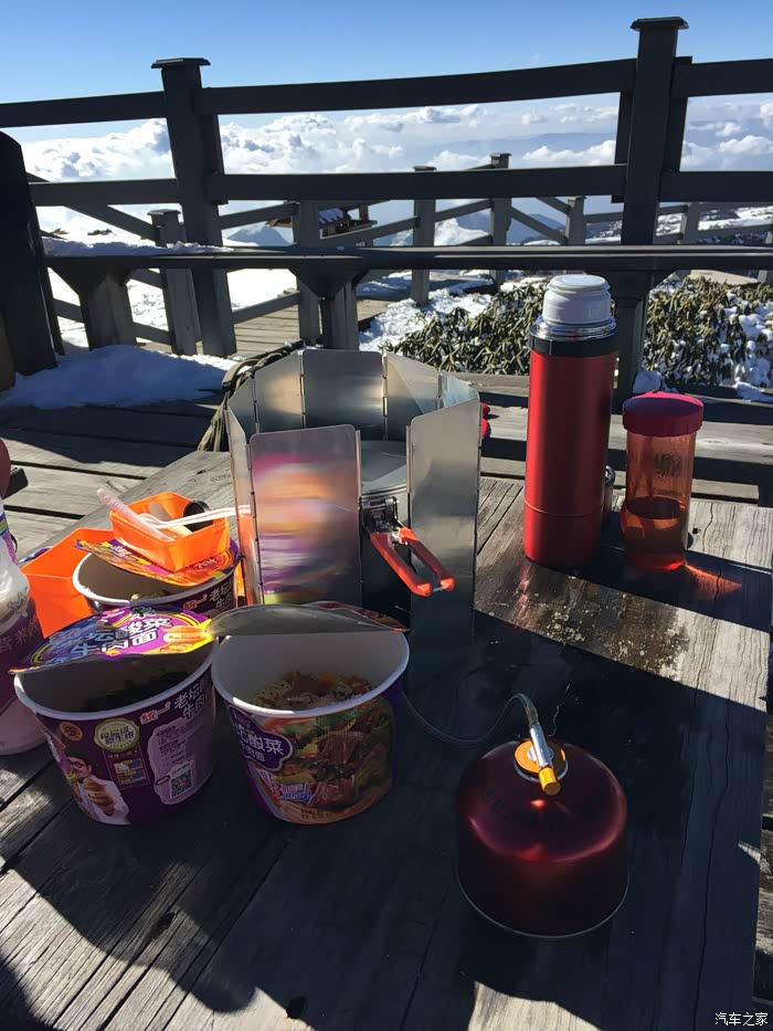 轿顶有20多平方米平整的石面,四周有围栏,当时竟然没有风,用自带的炉具烧开水烫方便面,感觉味道不一般,引来许多赞许。