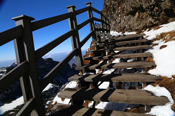 天越来越冷,栈道上的雪有的也结冰,摔跤是常事。