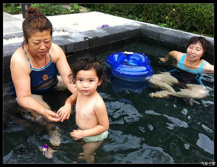温泉泳池的水温真是太舒适了,浮力也很大,诺诺非常开心地跟爸爸游来游去。