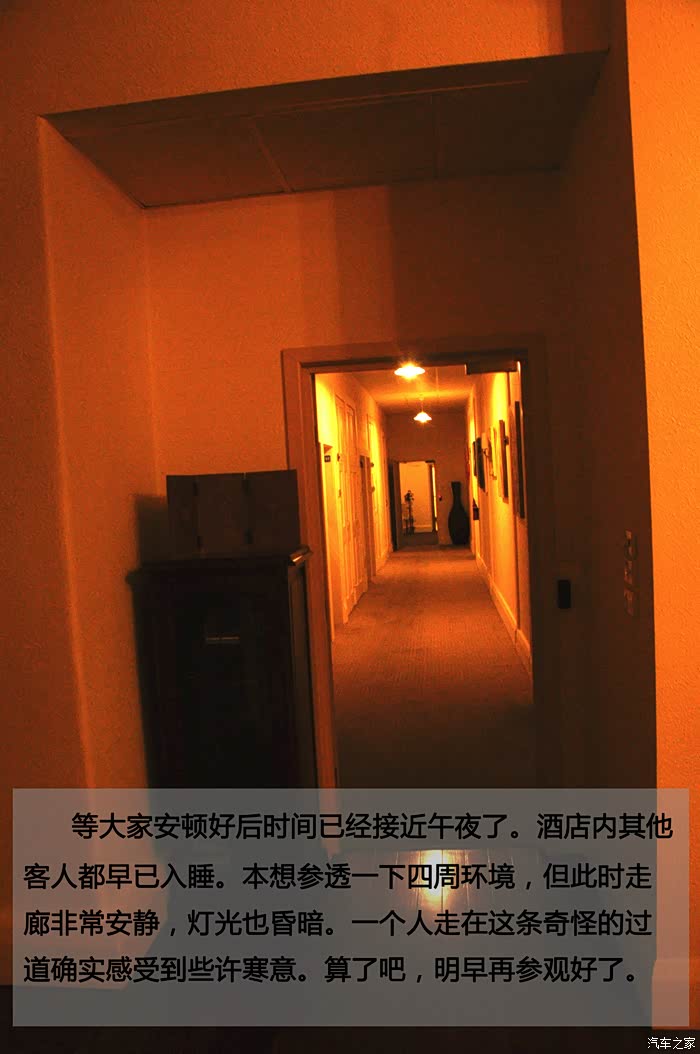 等大家安顿好后时间已经接近午夜了。酒店内其他客人都早已入睡。本想参透一下四周环境,但此时走廊非常安静,灯光也昏暗。一个人走在这条奇怪的过道确实感受到些许寒意。算了吧,明早再参观好了。
