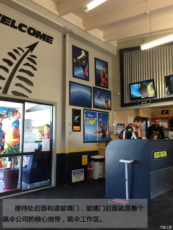 接待处后面有道玻璃门,玻璃门后面就是整个跳伞公司的核心地带,跳伞工作区。