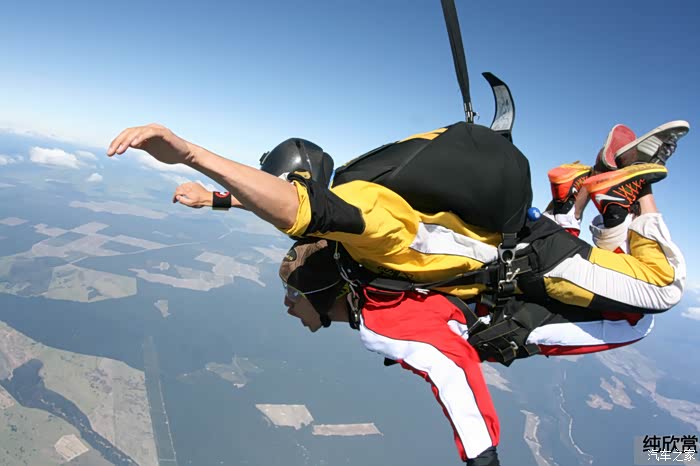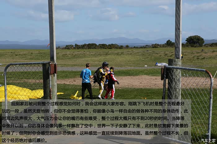 回到家后被问到整个过程感觉如何时,我会这样跟大家形容。刚跳下飞机时是整个历程最好玩的一段,虽然天旋地转,但你不会觉得害怕,你能像小鸟一样自由的做各种不同的身体动作,此时耳边风声很大,大气压力会让你的嘴巴有些难受,整个过程大概只有不到20秒的时间。当降落伞张开以后,你的身体会像风筝一样飘在了空中,世界一下子安静了下来,此时是欣赏脚下美景的时候了,但同时你会感觉到些许恐惧感,这种感觉一直延续到降落回地面。虽然整个过程不长,但这个经历绝对值回票价。